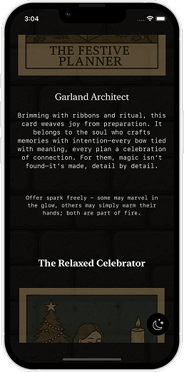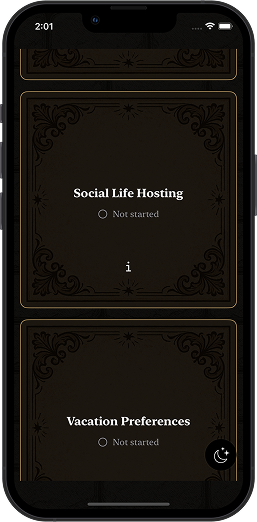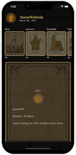 6 different questionnaires and personalities quizzes determine your unique and individual tarot lore that tells a story.