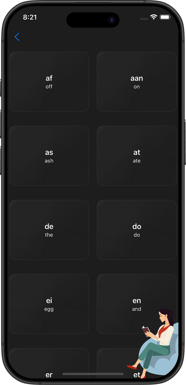 No clutter, no noise—just words and their meanings. This space is designed for clarity and calm, helping you focus on absorbing Dutch without distraction. Simple blocks, clean visuals, and bite-sized interactions make every tap count.